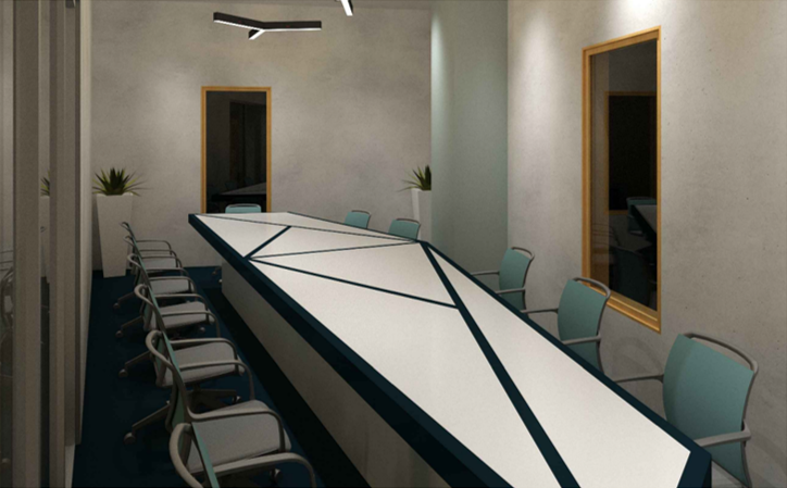 A bold and sophisticated workspace inspired by Art Deco design, featuring geometric patterns, rich materials, and statement lighting. The space blends luxury with functionality, creating an inspiring environment that enhances productivity and collaboration.
