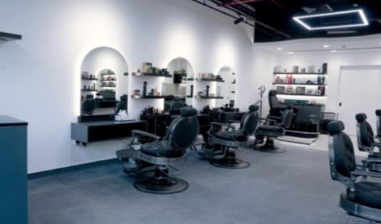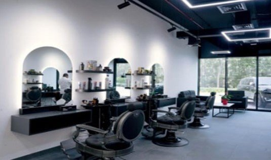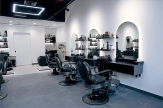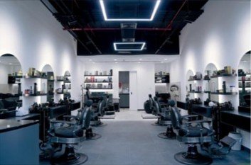A sleek and functional barbershop interior designed with clean lines, bold lighting, and efficient layout. Minimal tones, organized stations, and contemporary details create a professional yet inviting environment tailored for comfort and style.