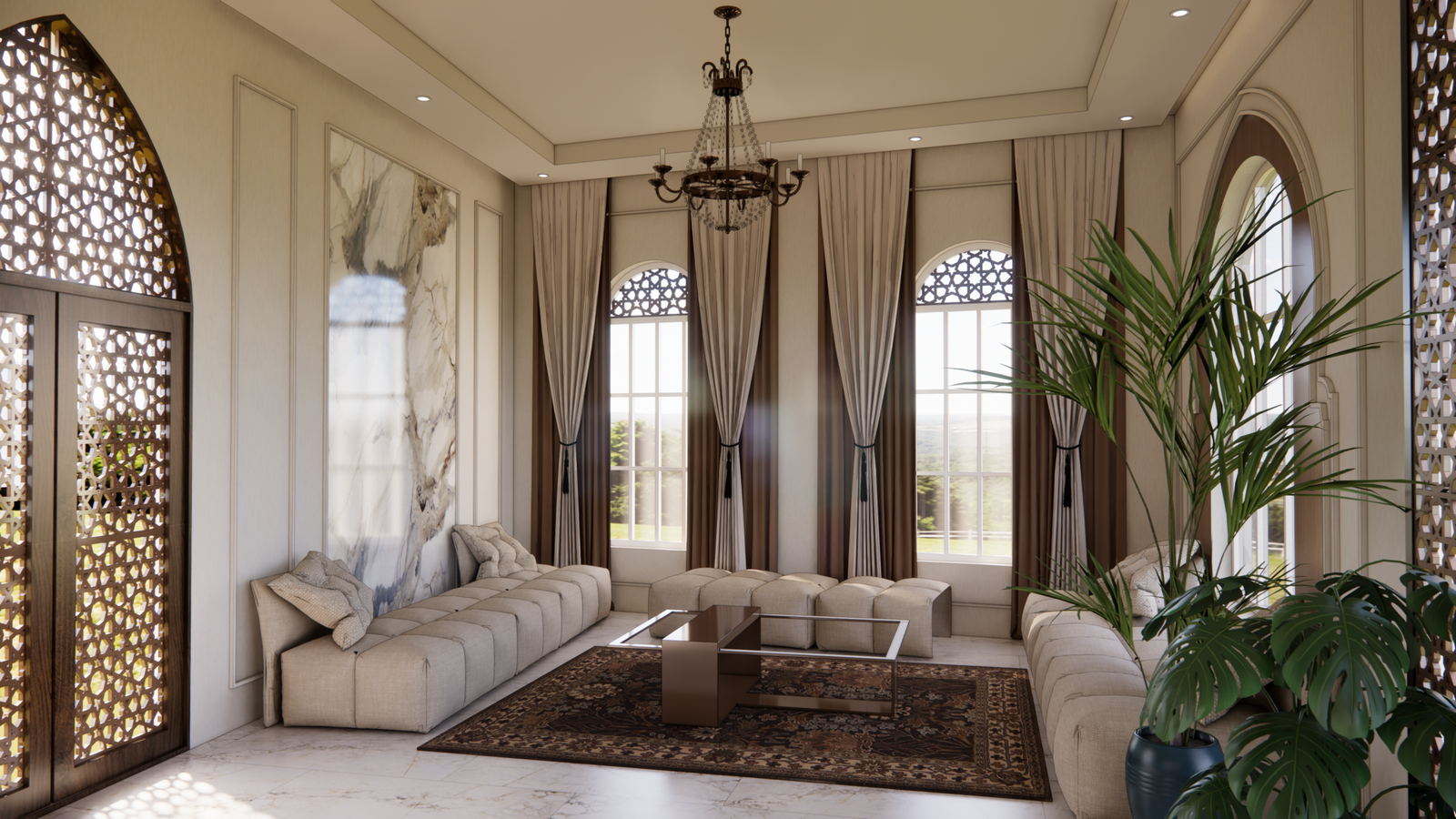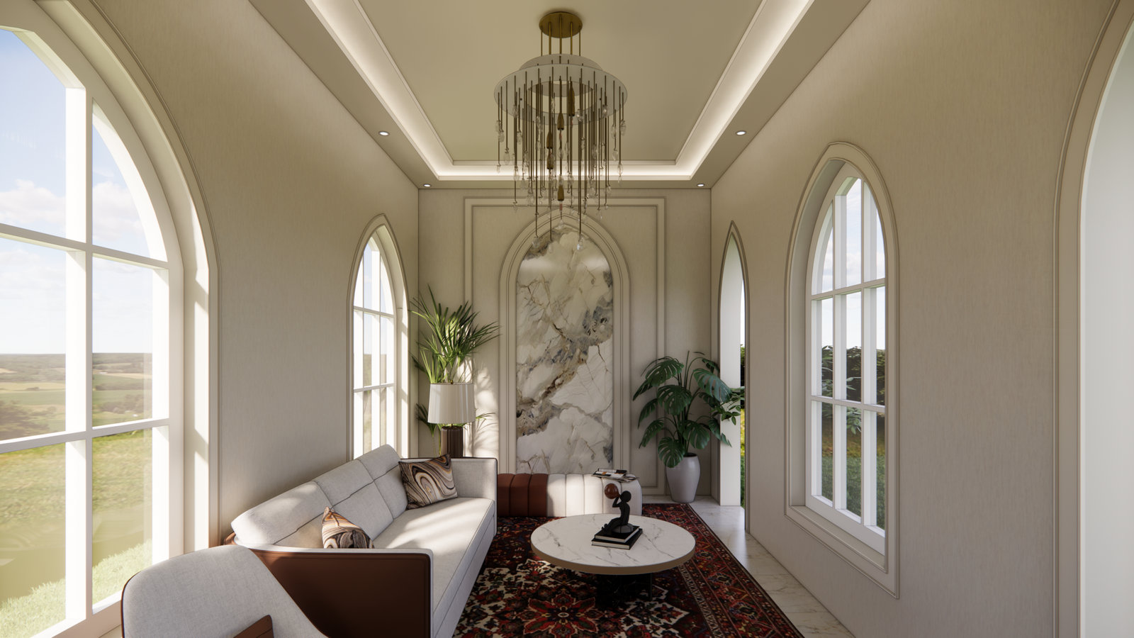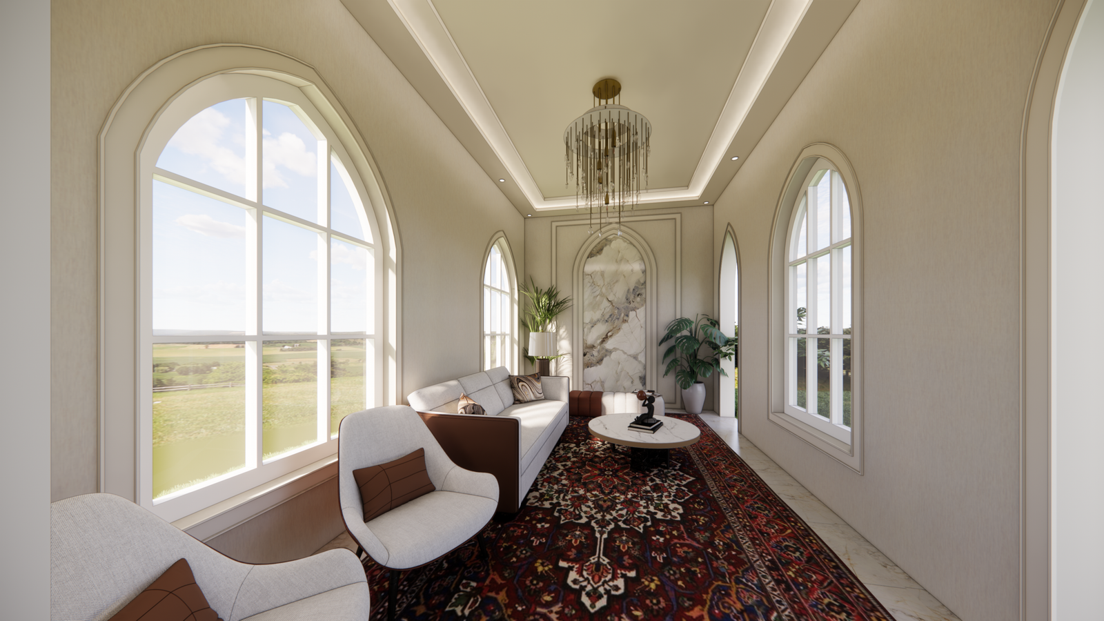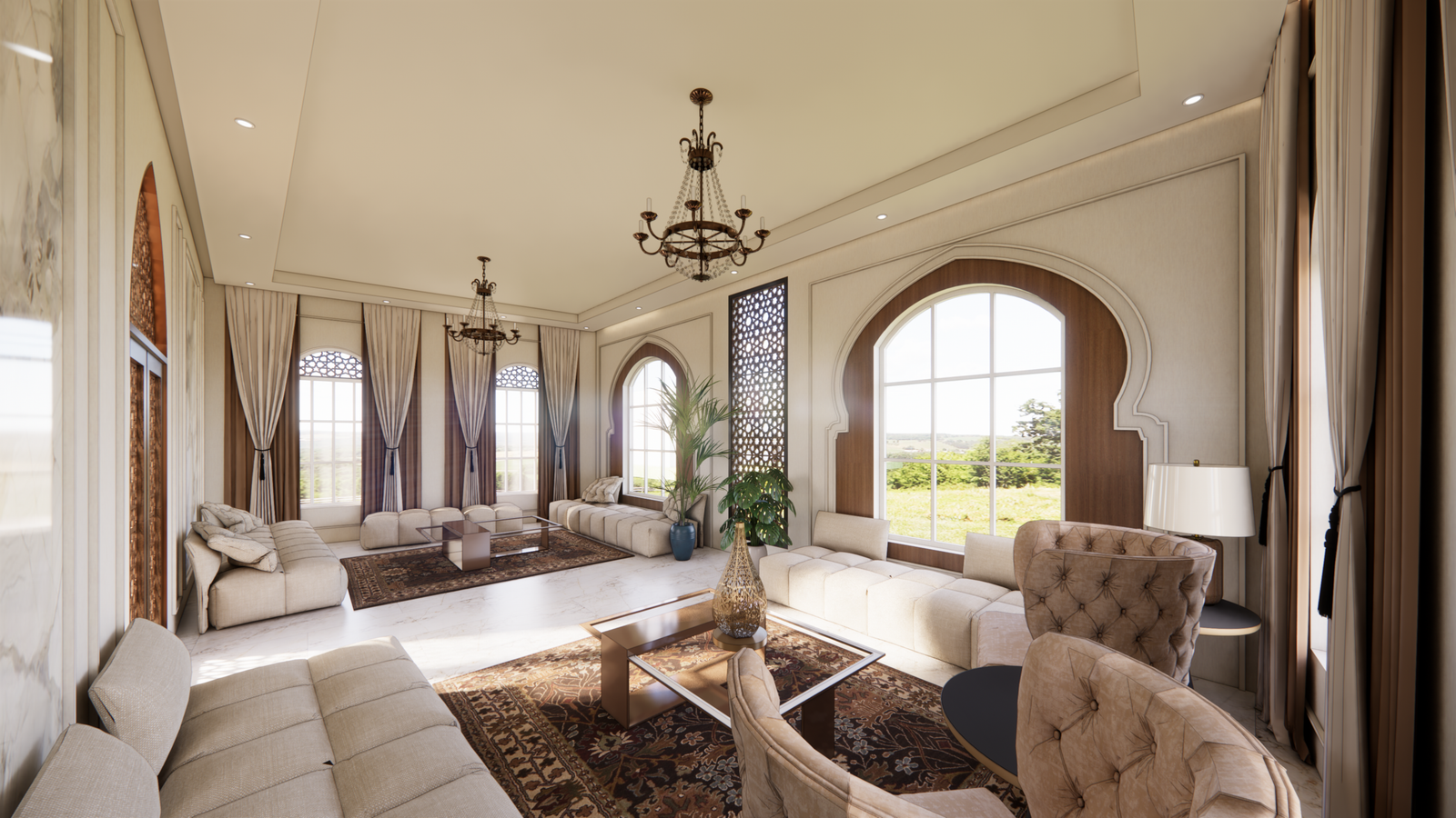 A refined blend of classic elegance and modern simplicity, featuring intricate detailing, warm materials, and balanced design. The space creates a welcoming and sophisticated atmosphere, perfect for both relaxation and social gatherings.